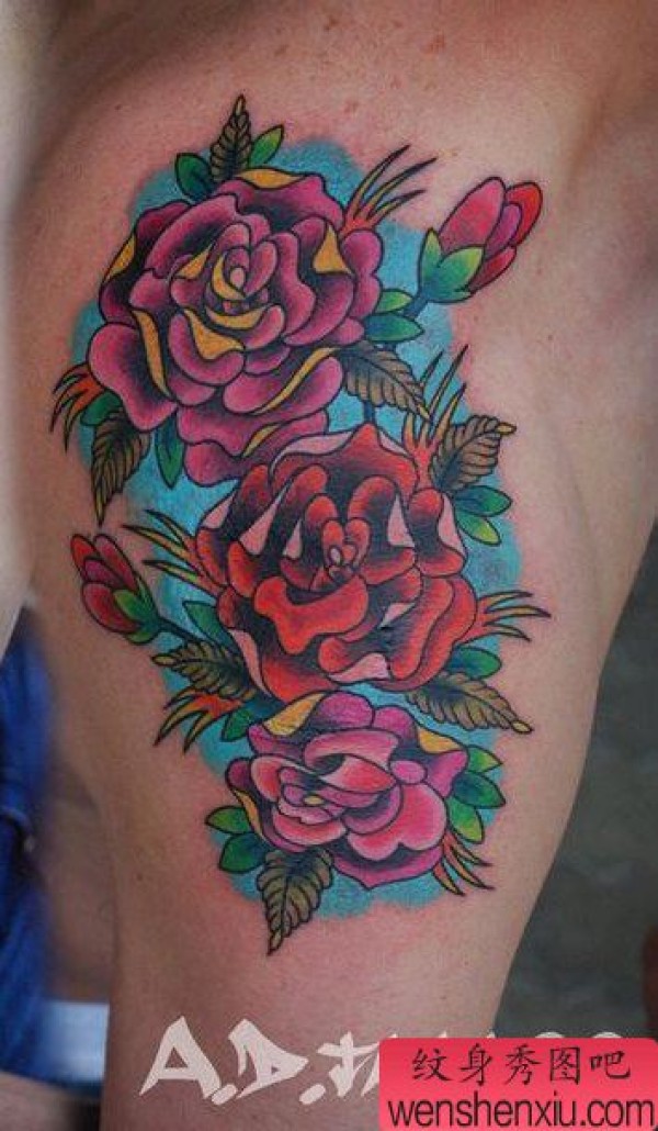 男生肩膀处时尚经典的玫瑰花纹身图案