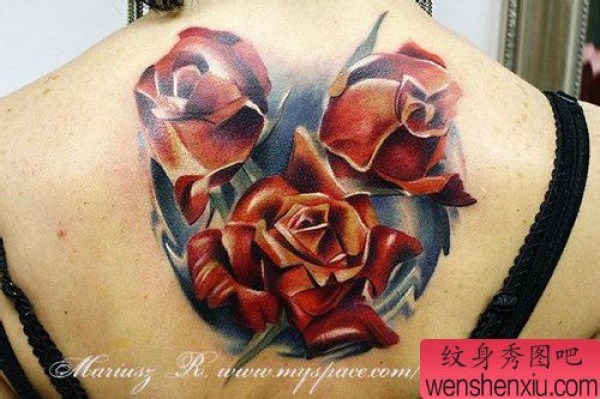 女生背部时尚精美的欧美彩色玫瑰花纹身图案