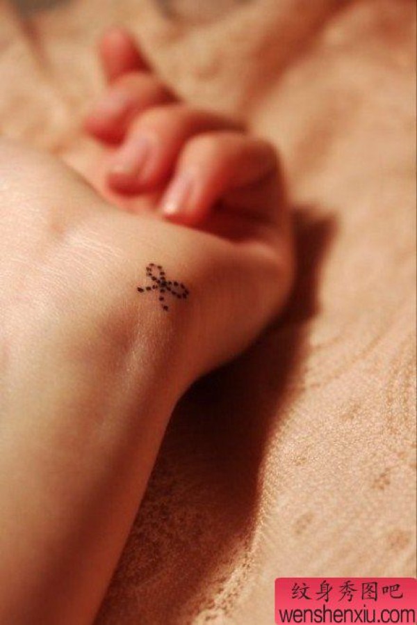 女生手腕处小巧时尚的蝴蝶结纹身图案