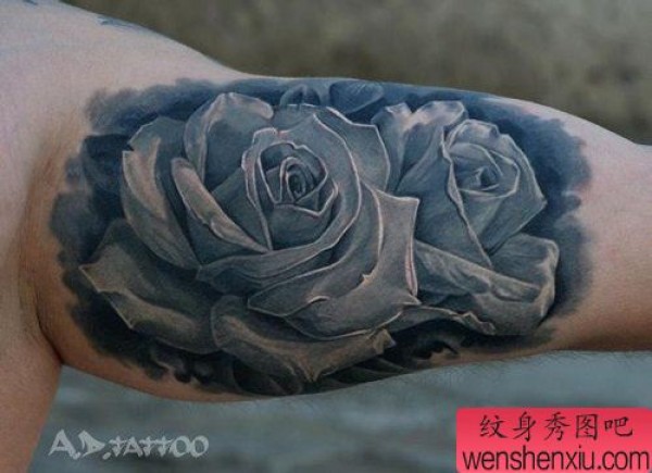 手臂内侧经典的欧美彩色玫瑰花纹身图案