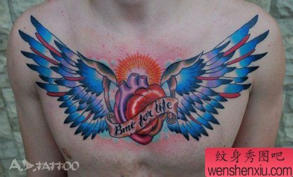 男士前胸超酷的翅膀心脏纹身图案
