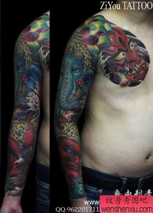 超酷的男士的半胛花臂般若象神纹身图案