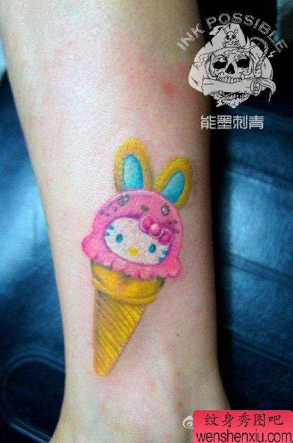 女生腿部可爱的猫咪兔子冰激凌纹身图案