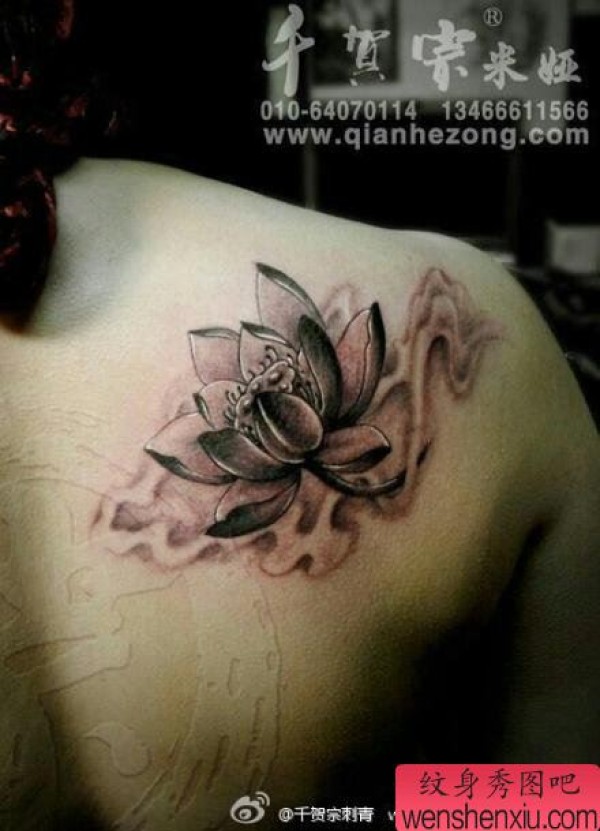 女生肩背唯美时尚的黑灰莲花纹身图案