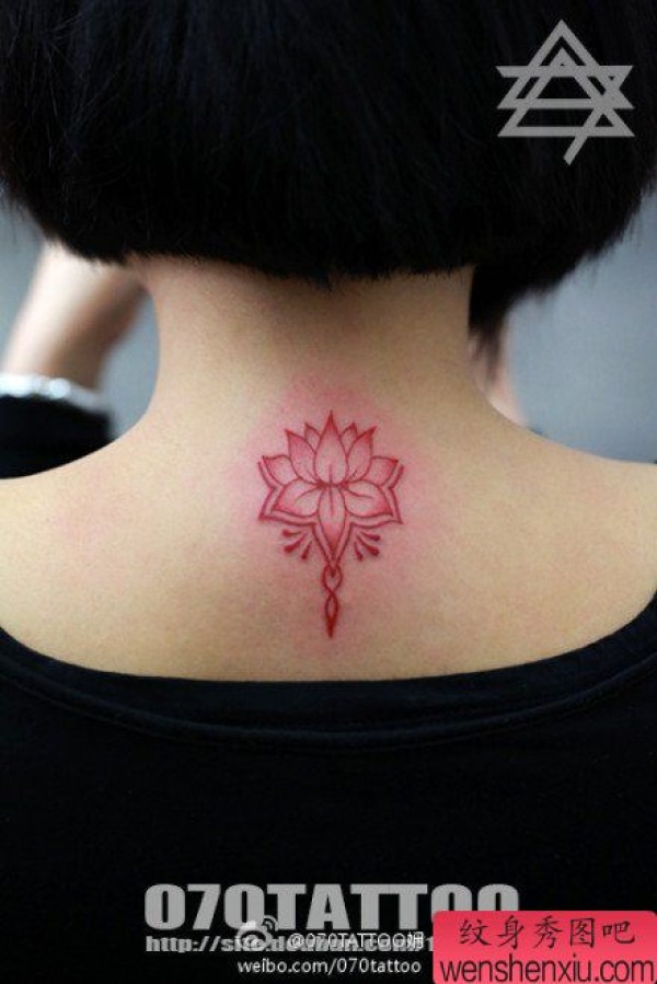 女生背部小巧精美的彩色莲花纹身图案