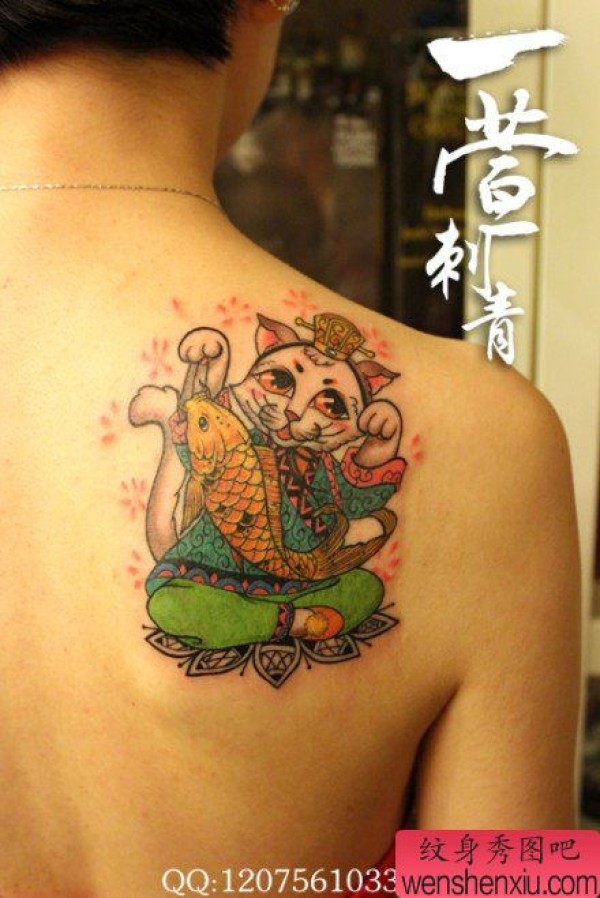 男生背部可爱时尚的猫咪钓鱼纹身图案