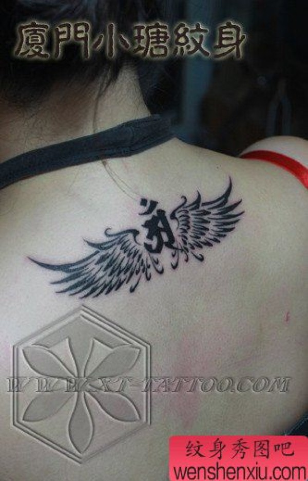 女生背部精美时尚的图腾翅膀纹身图案
