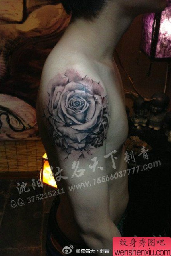 男生手臂唯美时尚的黑灰玫瑰花纹身图案