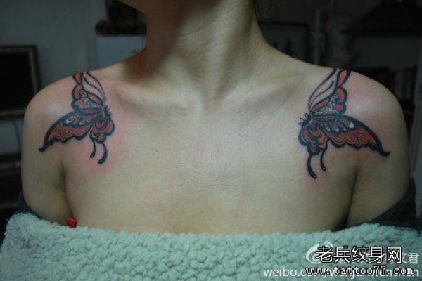女孩子肩膀处时尚好看的蝴蝶纹身图案