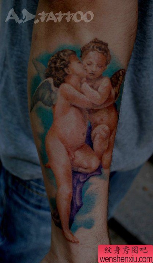 手臂可爱漂亮的彩色小天使丘比特纹身图案