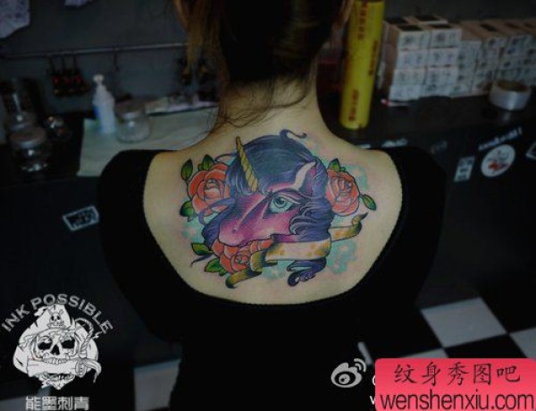 女生背部时尚时尚的独角兽纹身图案