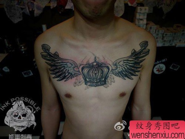 男士前胸帅气超酷的皇冠与翅膀纹身图案