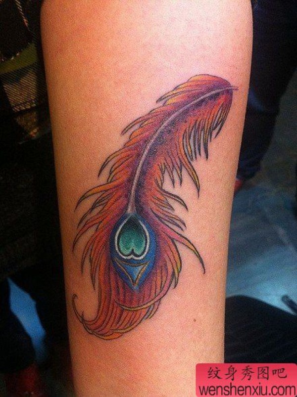 女生腿部精美漂亮的凤凰羽毛纹身图案
