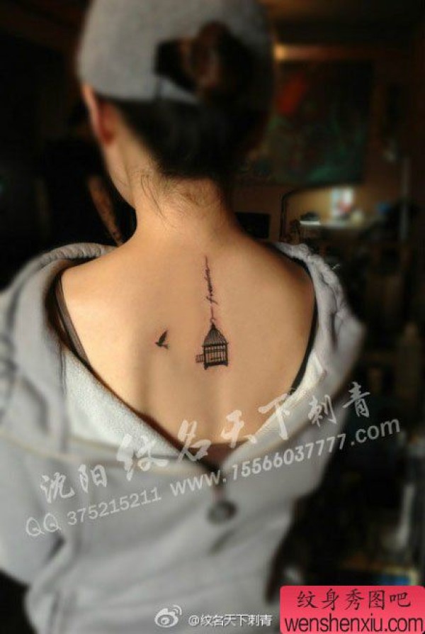 女生部位小巧时尚的小鸟鸟笼纹身图案