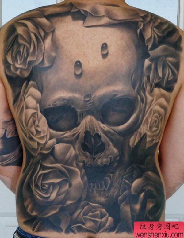 男士满背超酷的骷髅与玫瑰花纹身图案