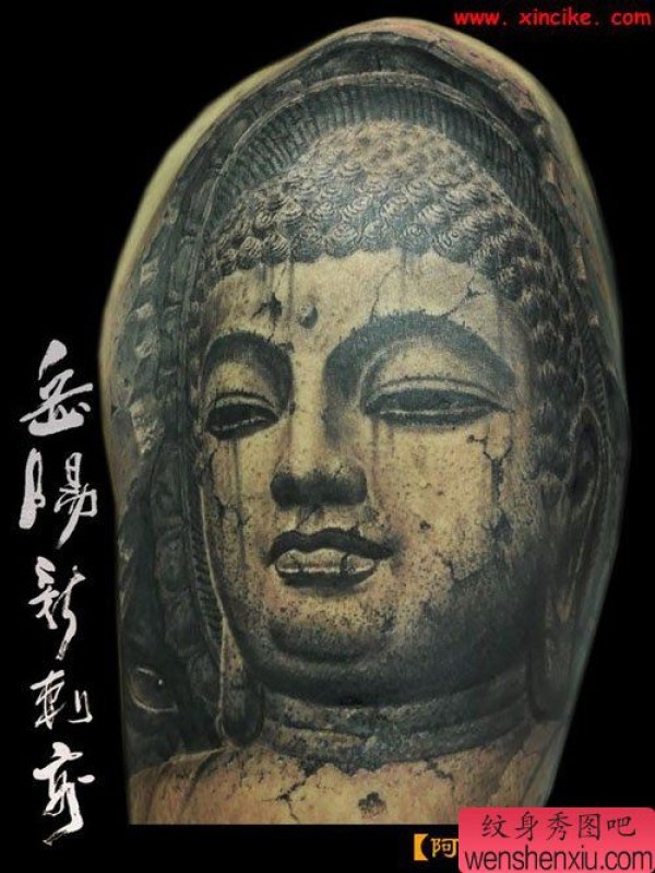 男士手臂经典时尚的石雕佛头纹身图案