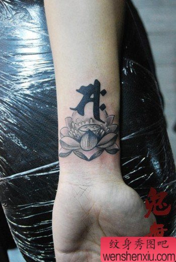 女生手腕唯美时尚的莲花与梵文纹身图案