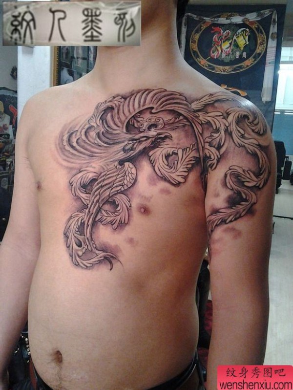 男士前胸超酷的黑灰凤凰纹身图案