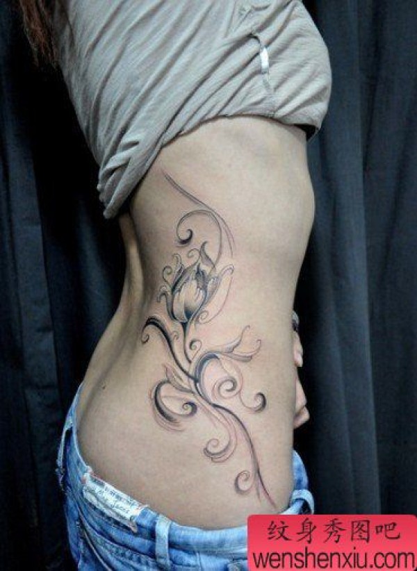 时尚时尚的美女腰部莲花藤蔓纹身图案