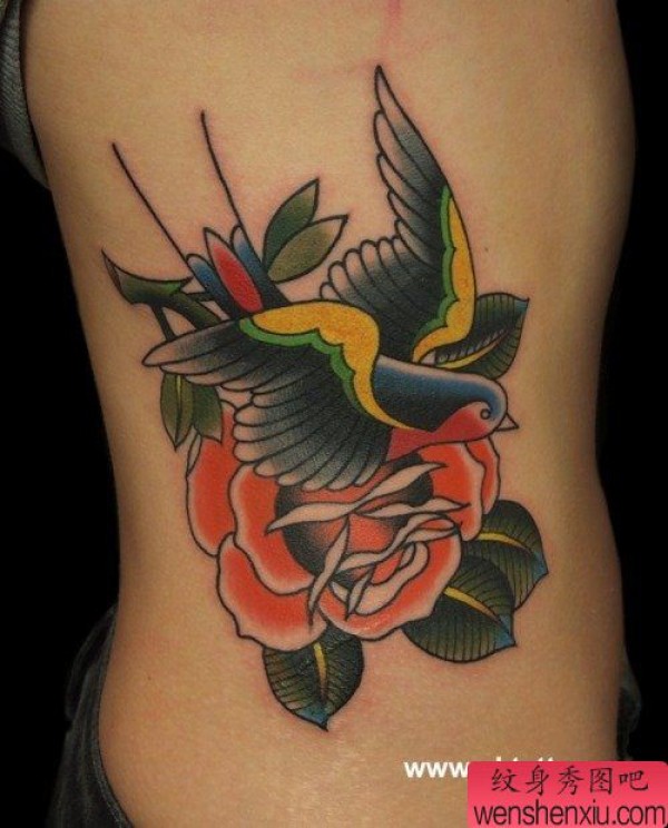 女生腰部漂亮的old school小燕子纹身图案