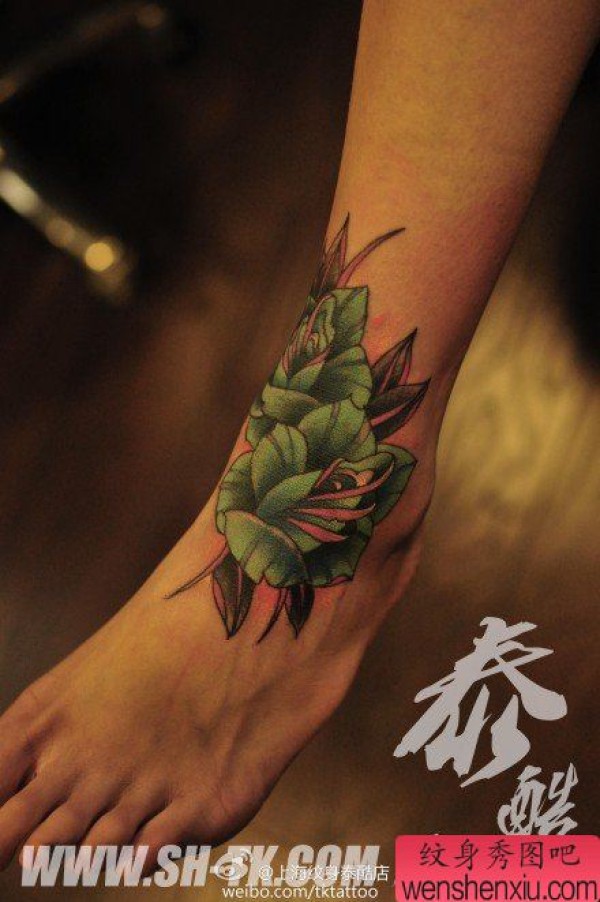 脚背好看的new school玫瑰花纹身图案