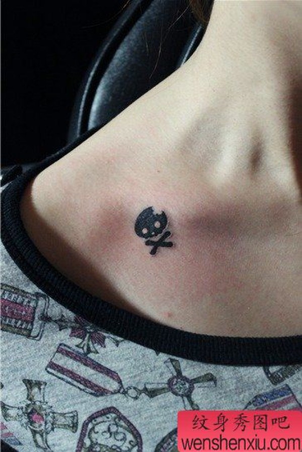 女生锁骨处小巧的图腾小骷髅纹身图案