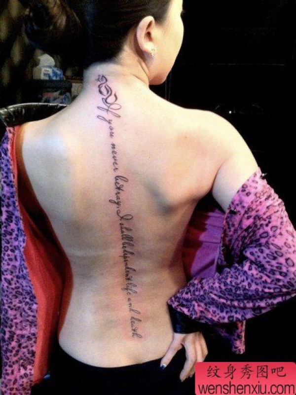 女生背部时尚时尚的脊椎字母纹身图案