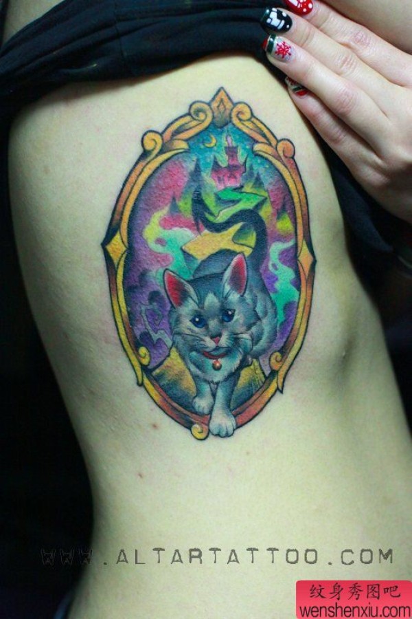 女生侧腰可爱时尚的猫咪纹身图案