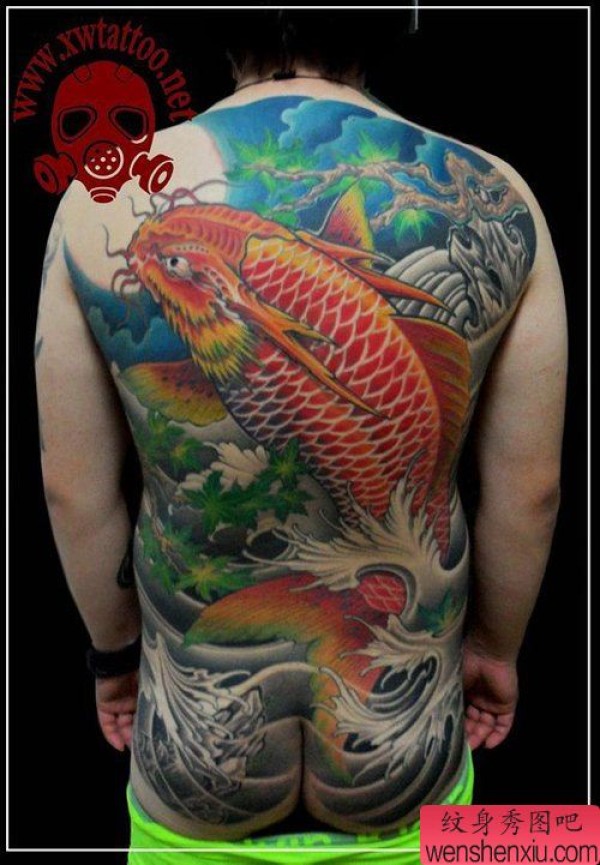 男士背部超酷的满背彩色鲤鱼纹身图案
