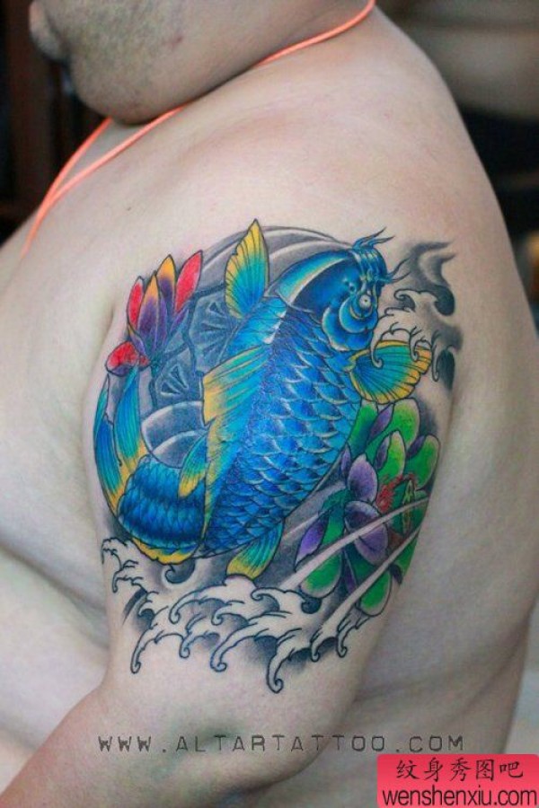 唯美帅气的手臂彩色鲤鱼纹身图案