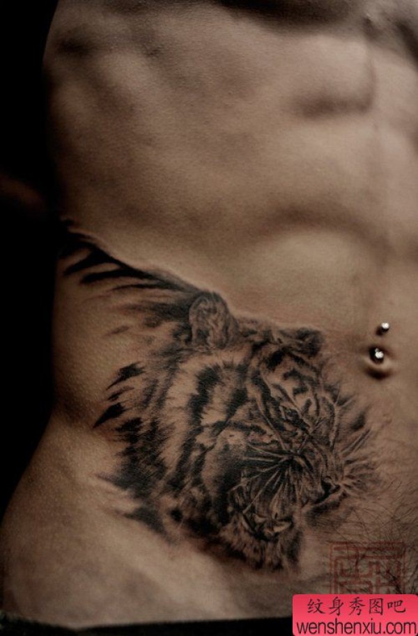 男士腹部经典很酷的虎头纹身图案