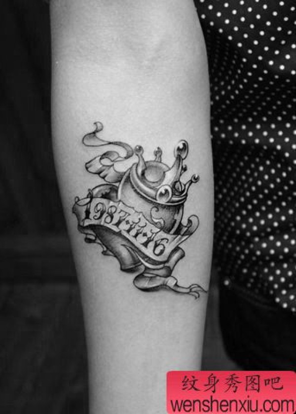 女生手臂时尚清晰的爱心皇冠纹身图案