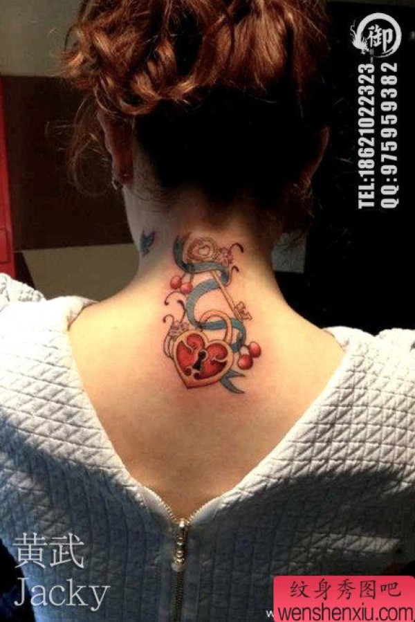 女生颈部小巧时尚的爱心锁与钥匙纹身图案