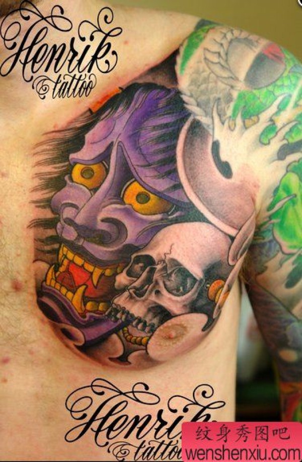 男士前胸经典帅气的般若骷髅纹身图案