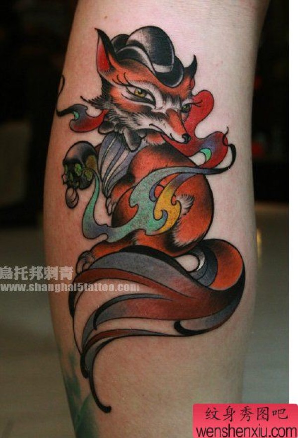 腿部一张新式传统狐狸纹身图案