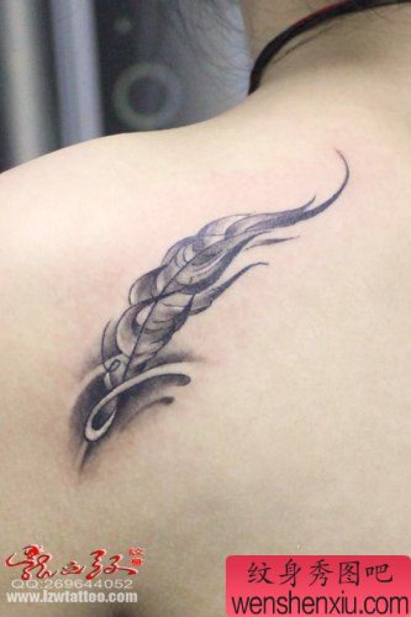 美女肩背小巧唯美的羽毛纹身图案