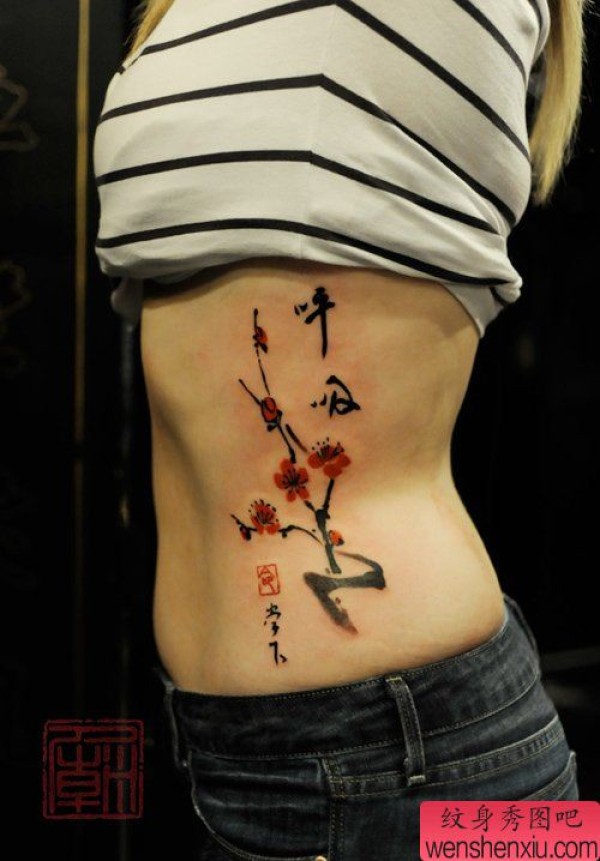 美女侧腰唯美时尚的梅花与汉字纹身图案