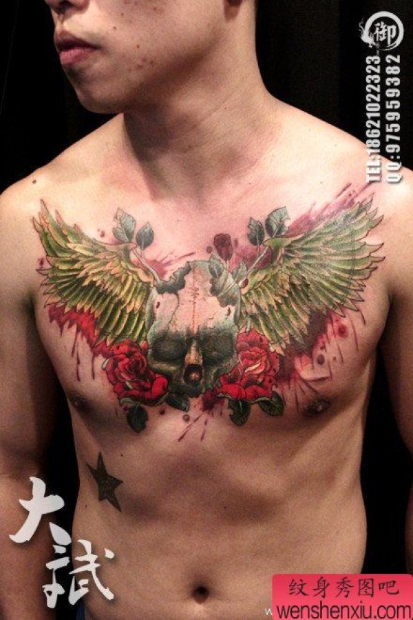 前胸时尚霸气的翅膀与骷髅纹身图案