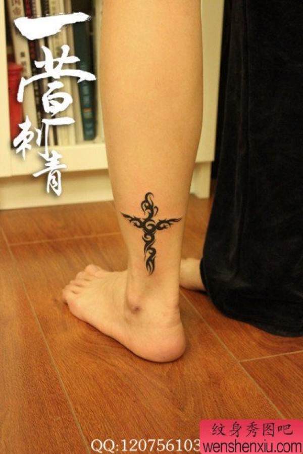 女生腿部时尚精美的图腾十字架纹身图案