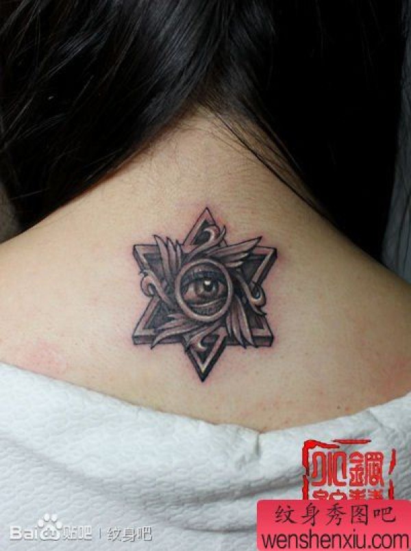 女生背部时尚的眼睛与六芒星纹身图案
