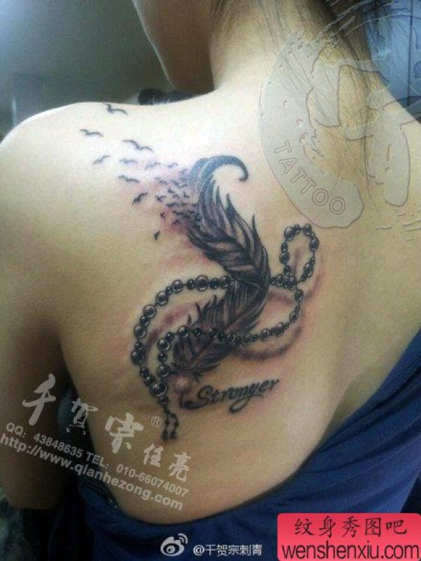 女生肩背时尚唯美的羽毛与项链纹身图案