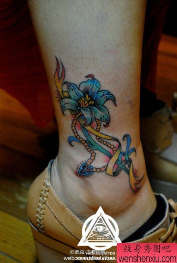女生腿部漂亮的彩色百合花纹身图案