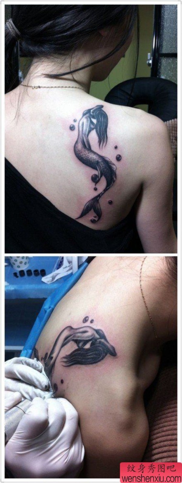 女生后肩背唯美漂亮的美人鱼纹身图案