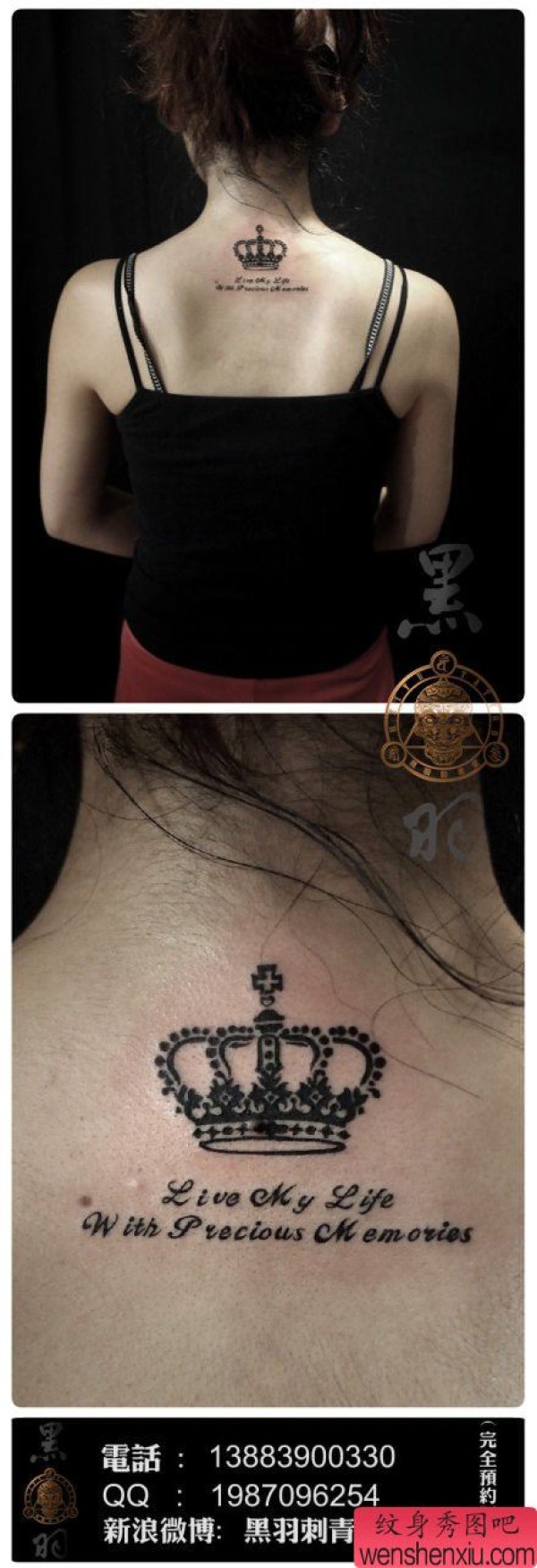 女生背部小巧时尚的的皇冠与字母纹身图案