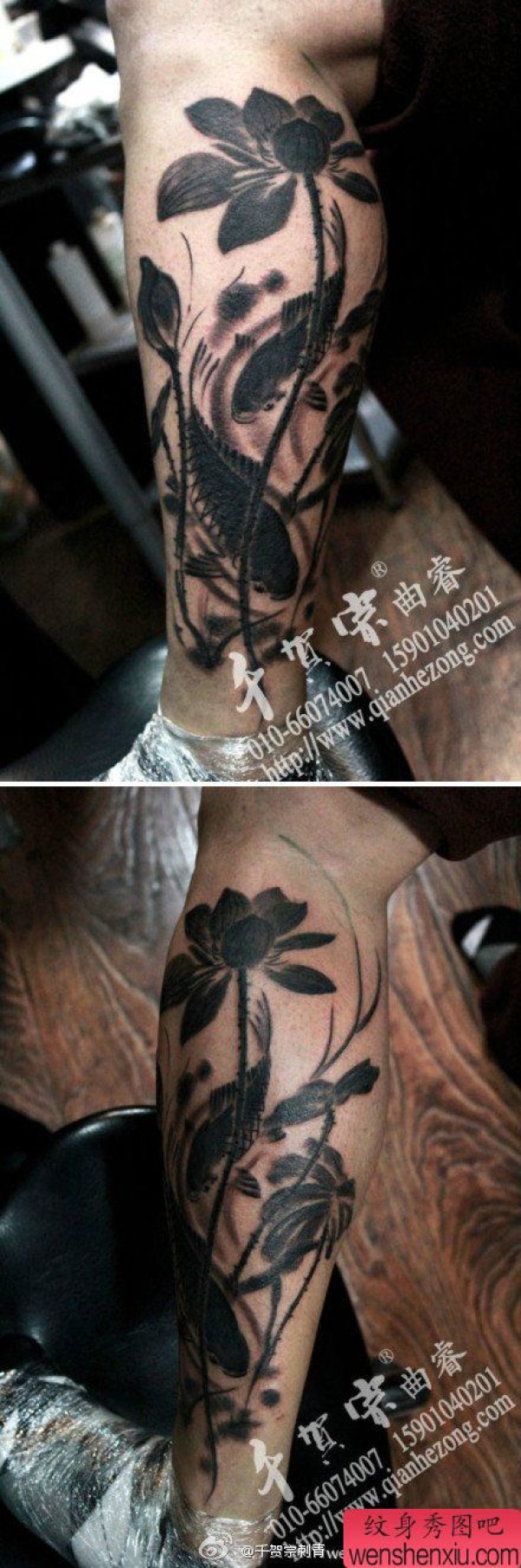 腿部时尚时尚的水墨莲花鲤鱼纹身图案