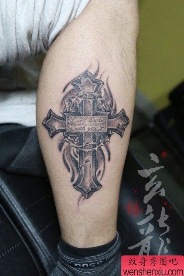 腿部帅气时尚的十字架纹身图案