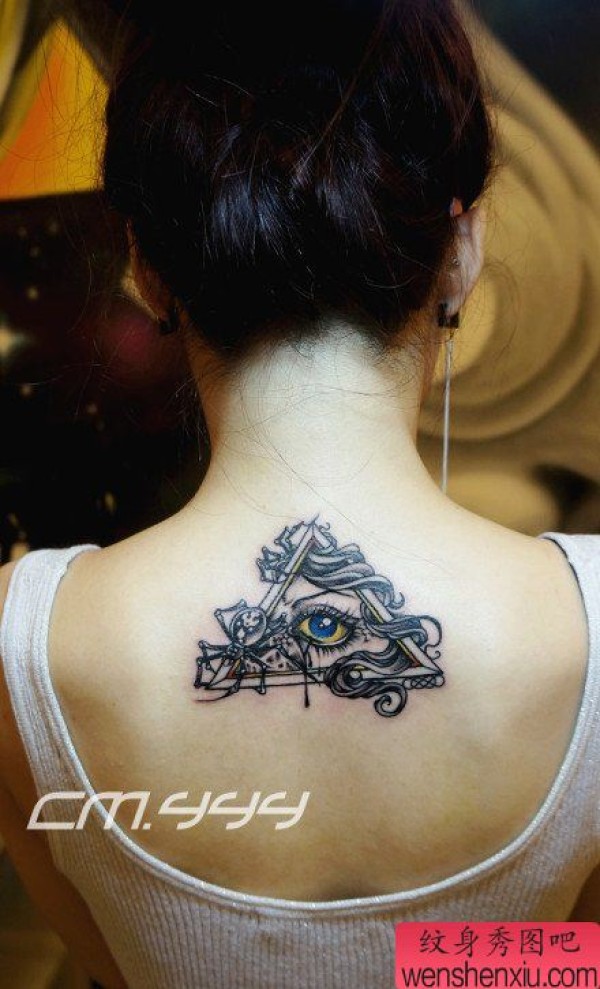 女生后背时尚经典的蜘蛛与眼睛纹身图案