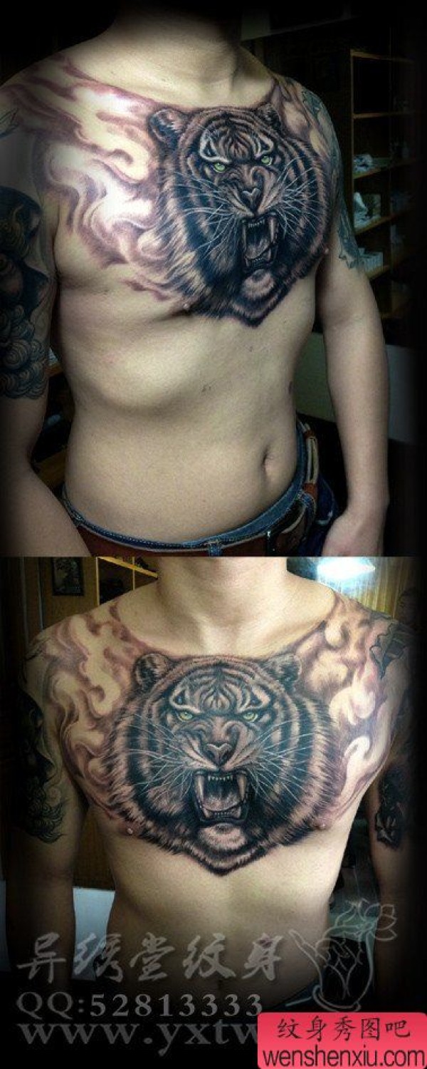 男士前胸超酷的黑灰虎头纹身图案