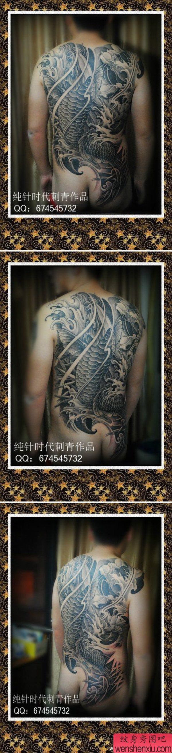 男士后背霸气的满背黑灰鲤鱼纹身图案