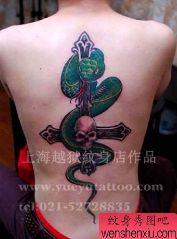 男生后背时尚帅气的蛇与十字架纹身图案
